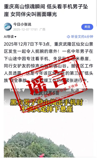 12月7日,有网民发布了一篇帖文,声称“2025年12月7日下午3点,重庆武隆区仙女山景区发生一起令人扼腕的意外!一名中年男子在下山途中因专注看手机,失足坠入百米悬崖,据景区工作人员透露,这是该区域发生第三起低头族安全事故”,帖文中配有游客爬山和坠入悬崖的照片,引起了网民的广泛关注和担忧。