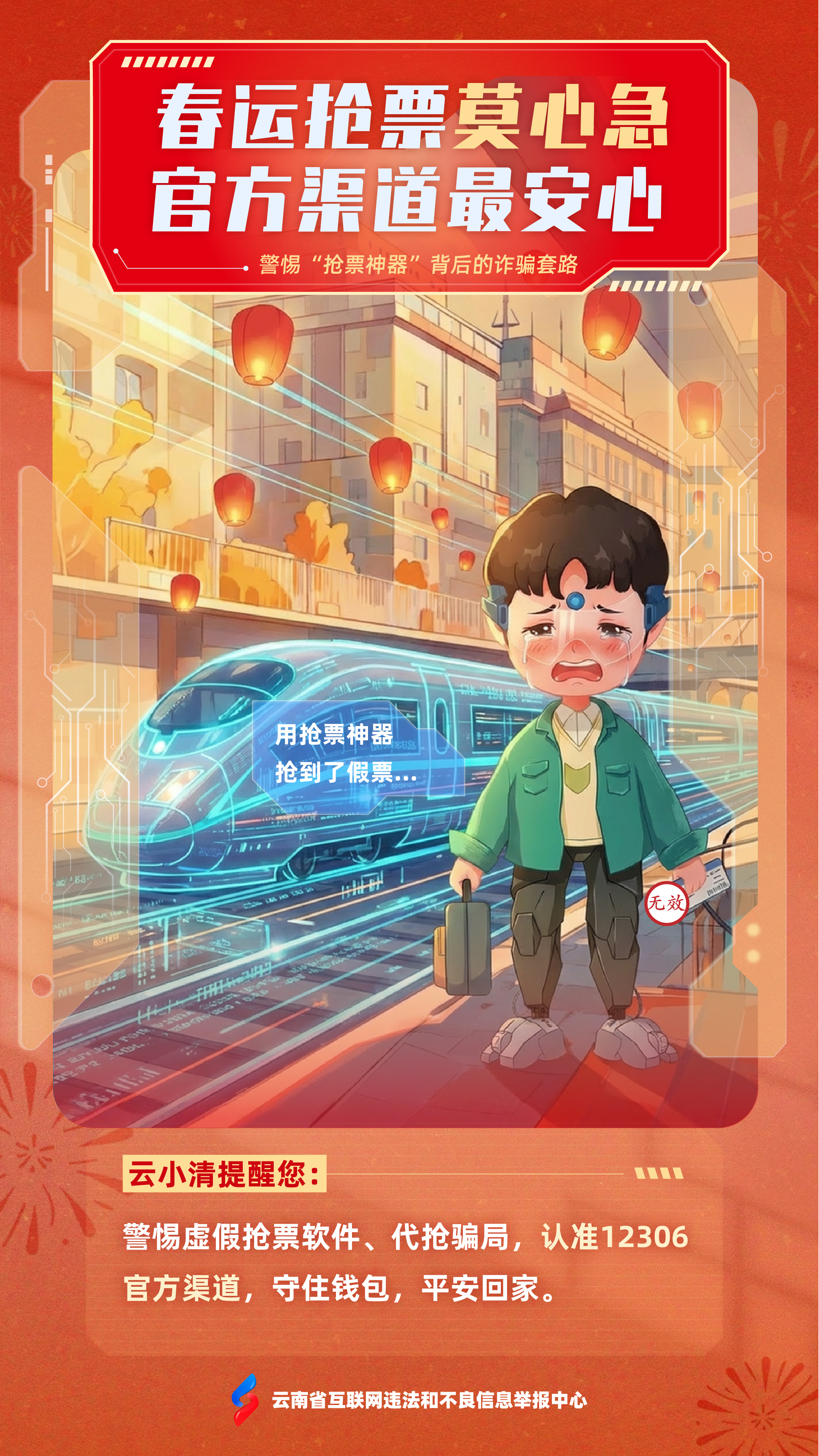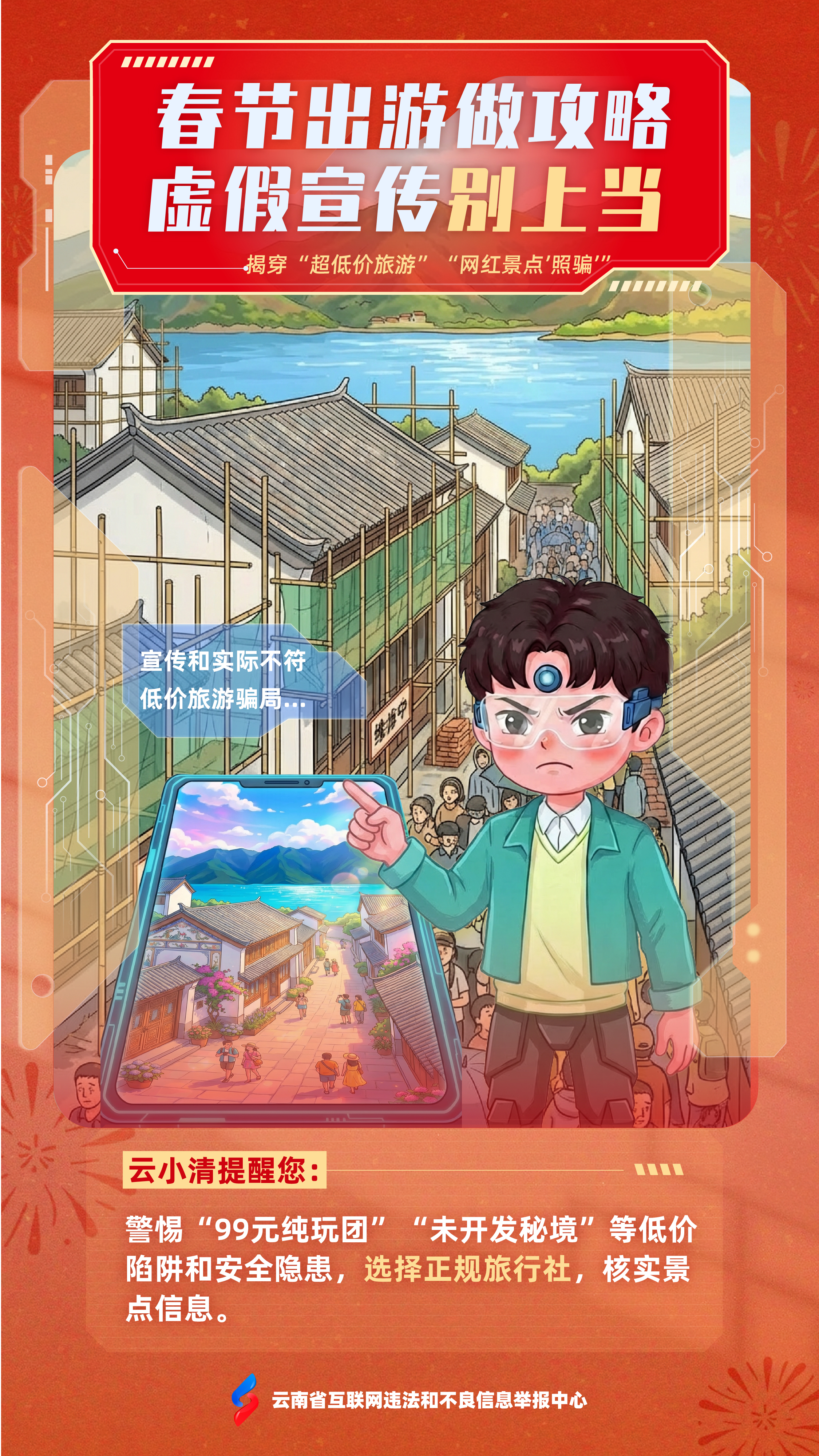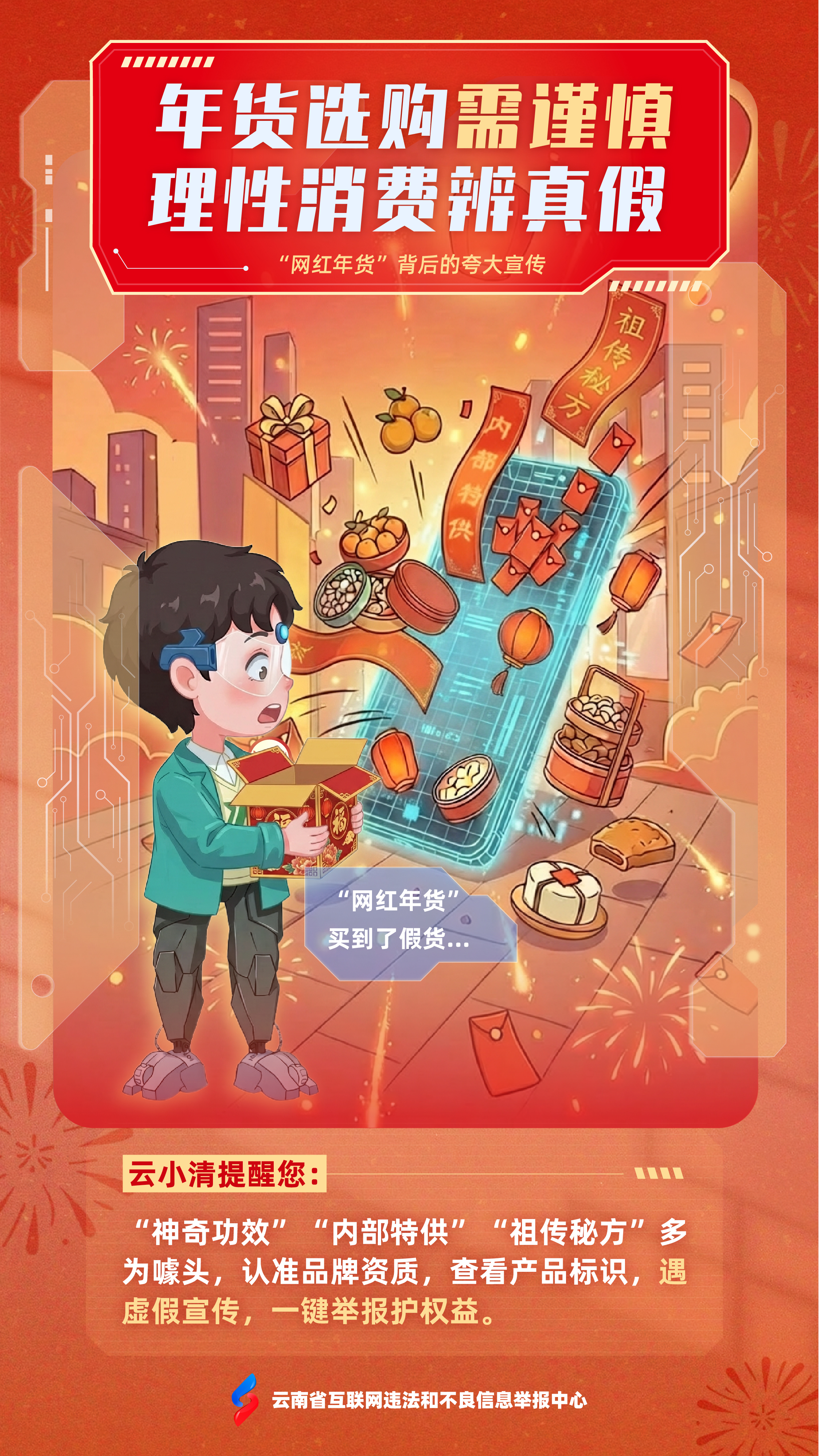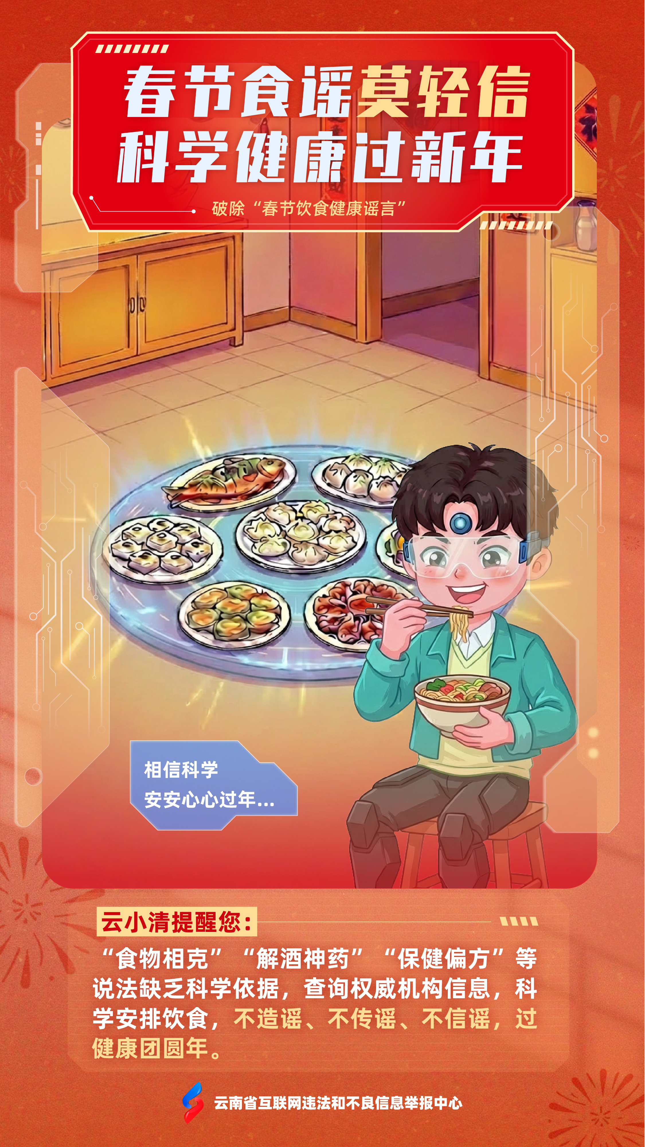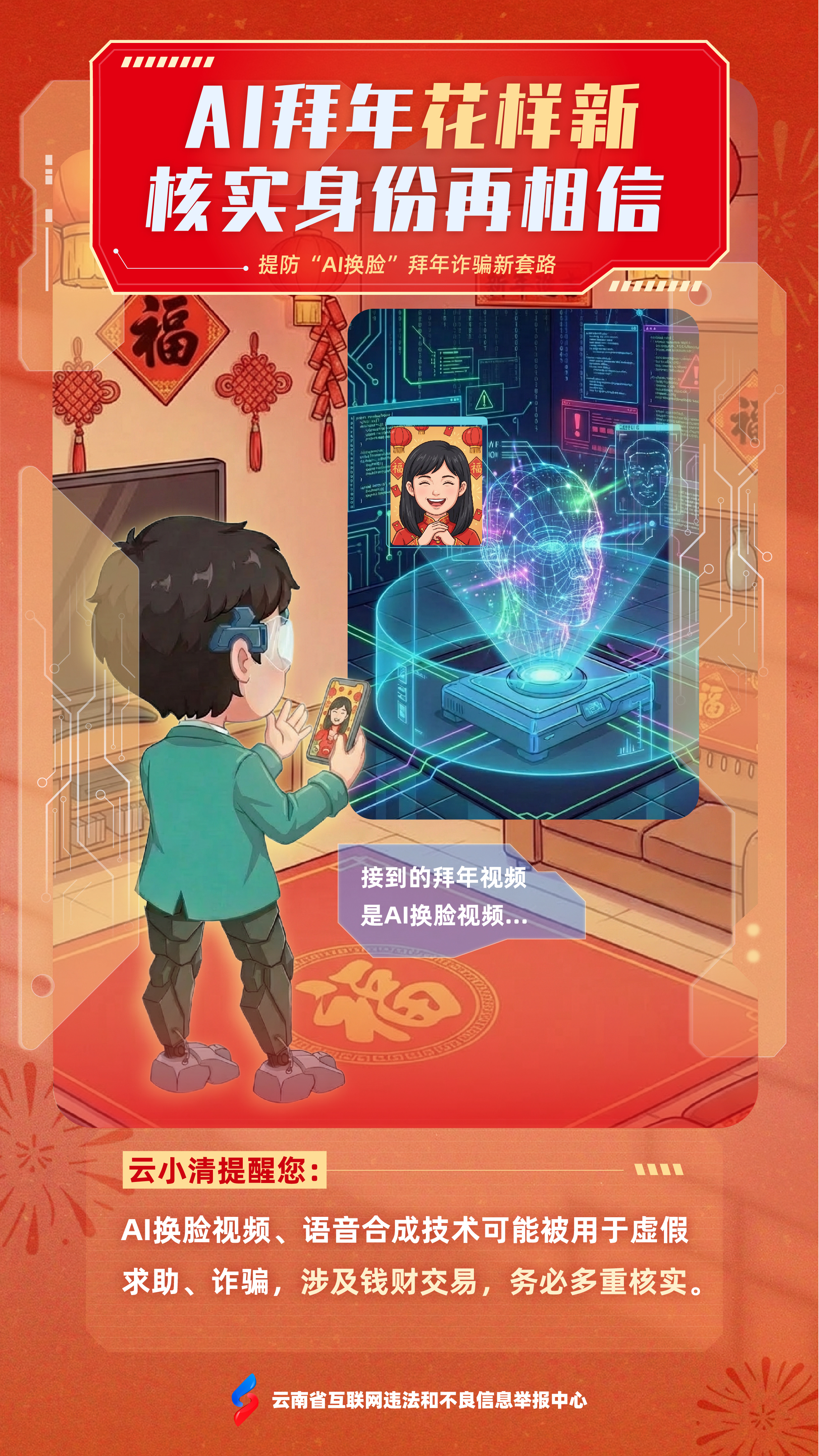 值此新春佳节、万家团圆之际,为营造清朗祥和的节日网络环境,云南省互联网违法和不良信息举报中心携手“云小清”,精心打造“春节护网・谣言零传播”主题系列海报,以兼具传统年味与科技美感的数字国潮视觉,为您送上一份特别的“新年网络平安”祝福。
