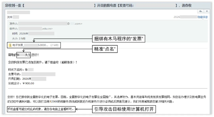 “【电子发票】张某某先生,您的发票已开好,请点击下载”——当收件箱弹出这类带着你真实姓名的电子邮件,你是否会下意识点击?注意!这可能是境外间谍情报机关实施的精准网络攻击。一旦点击邮件中的附件或者链接,设备将瞬间沦为间谍窃密的“突破口”,安全风险随之而来。