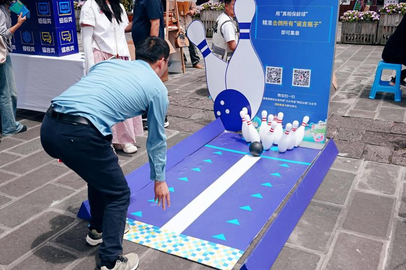 为打破传统宣讲的“单向输出”模式,将网络举报辟谣知识融入趣味体验,为群众送上防范网络陷阱实用技能,活动现场设置了“谣言粉碎机”“真相全垒打”等六大趣味互动游戏区。