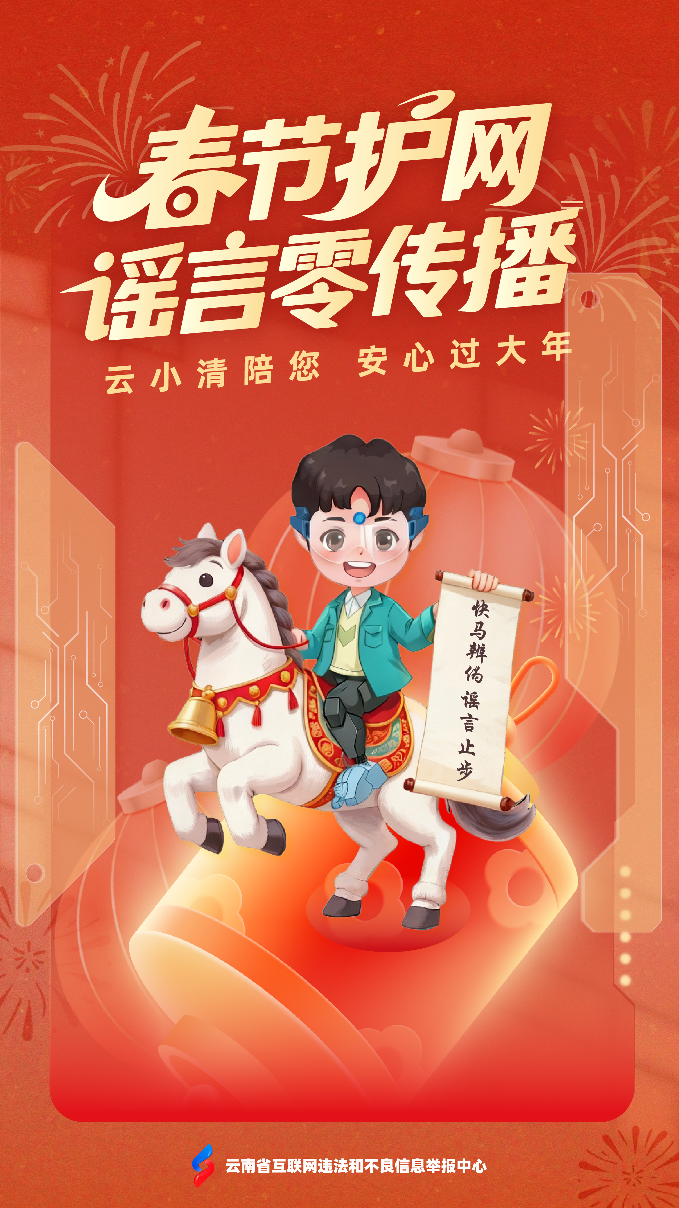 值此新春佳节、万家团圆之际,为营造清朗祥和的节日网络环境,云南省互联网违法和不良信息举报中心携手“云小清”,精心打造“春节护网・谣言零传播”主题系列海报,以兼具传统年味与科技美感的数字国潮视觉,为您送上一份特别的“新年网络平安”祝福。